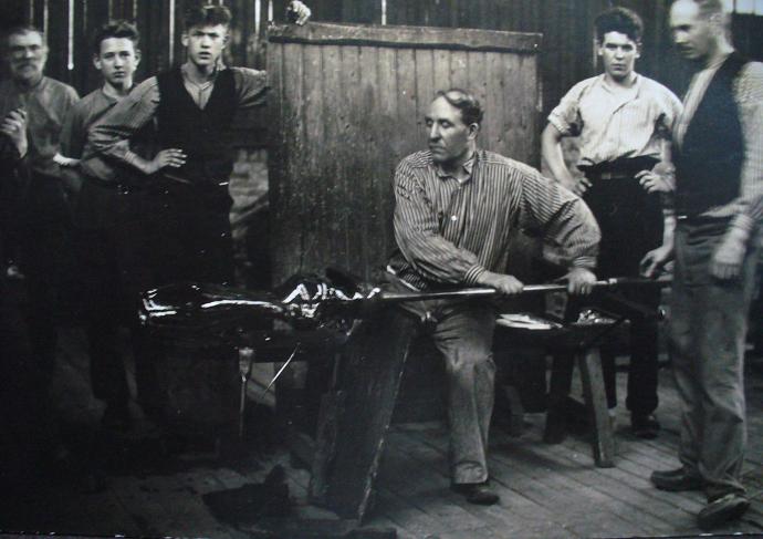 Bild 1: Ett oskrivet vykort med Gustafs verkstad, tippar att det är sent 1920-tal. Snett bakom till höger om mästarstolen står den då unge sonen Nisse som även han blev mästare där i Orrefors.