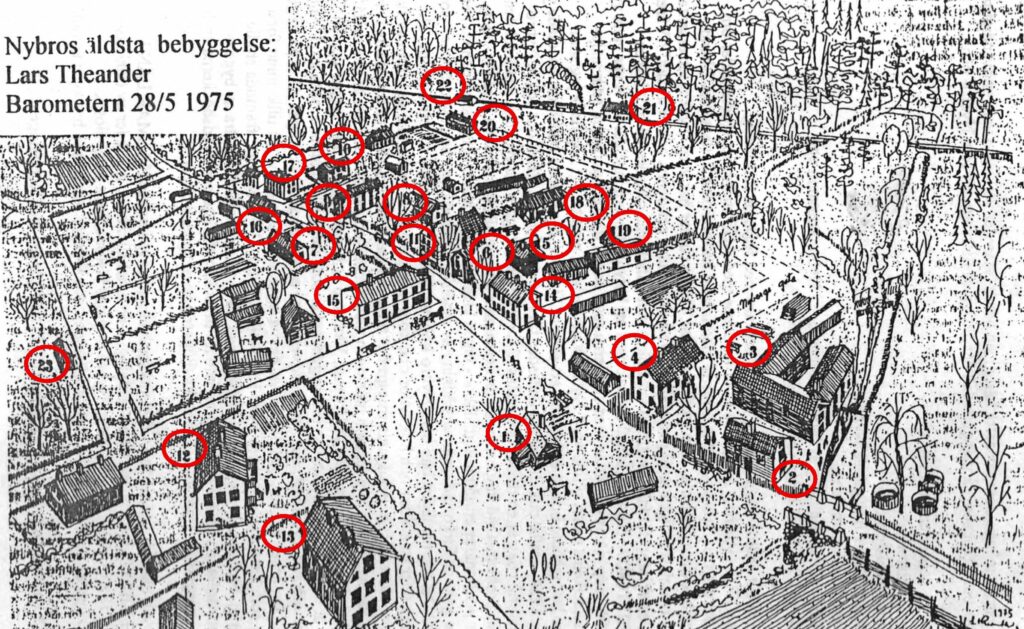 Nybros äldsta byggnad, nr 1 på bilden, år vård ett särskilt kapitel. Redan 1813 användes stugan av mor Stina-Kajsa som serveringslokal och raststuga för resande. Troligen är denna låga knuttimrade boning identisk med det s k Nybrotorpet på Göljemåla ägor, som anlagts redan på 1780-talet. Det framgår av gamla rättsprotokoll att torparen tidigare drivit krogrörelse som extraknäck.